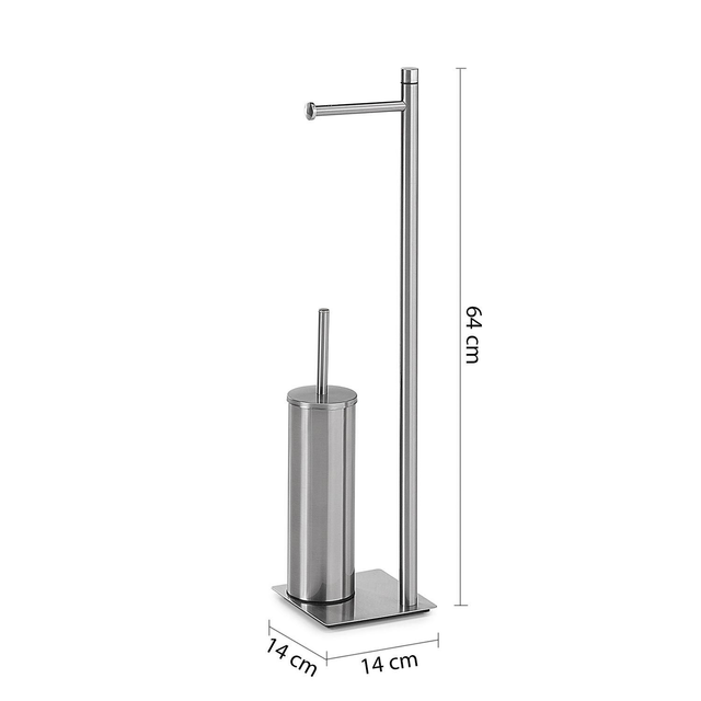 Piantana porta rotolo e scopino wc in acciaio spazzolato, scopino con ciuffo in setole nero e tazza interna estraibile idonea ad una facile pulizia.