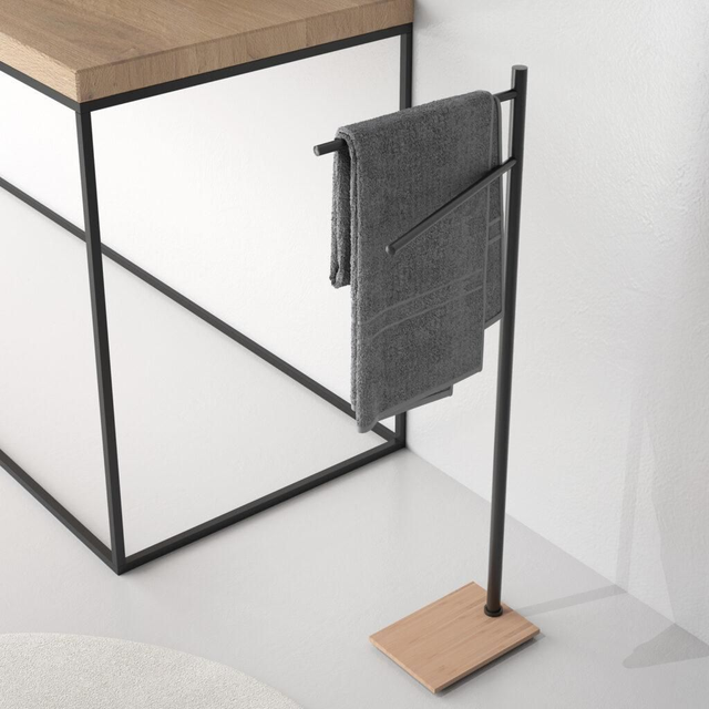 Piantana porta salviette 2 braccia nera , con base col. nero o naturale , scopino con ciuffo in setole nero e tazza interna estraibile idonea ad una facile pulizia.