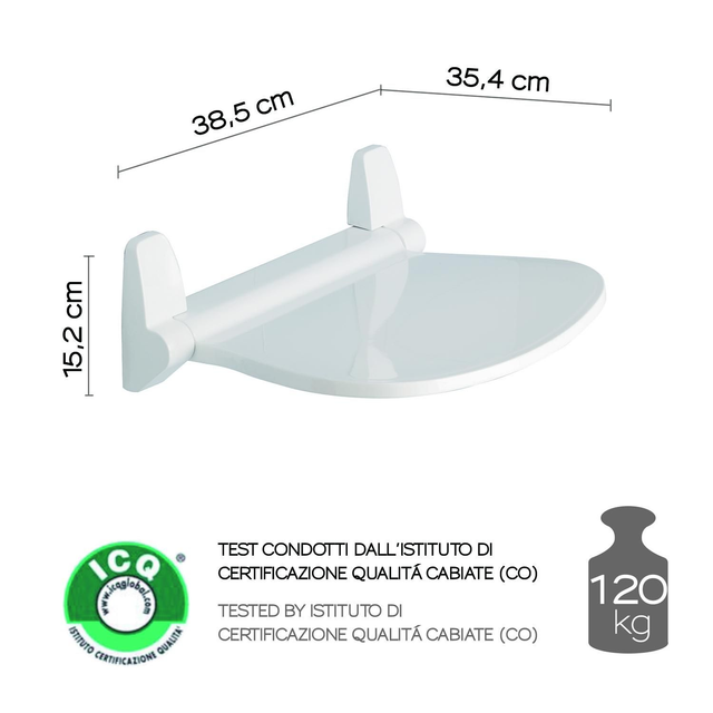 Sedile ribaltabile per doccia. plus prodotto: test condotti dall’istituto di certificazione di qualitá, en1728:2012+ac:2023. carico testato 120 kg