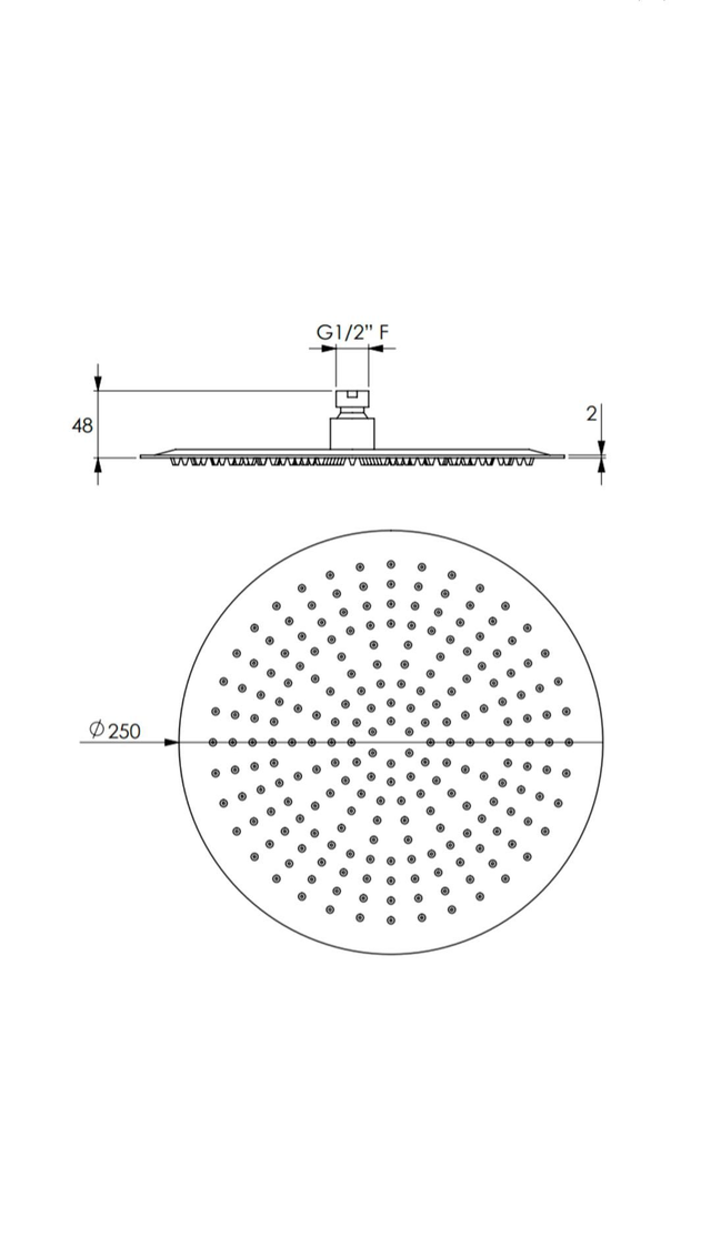 Soffione doccia d. 25 cm , spessore 2 mm, in acciaio inox , con 126 ugelli anticalcare, 1/2"